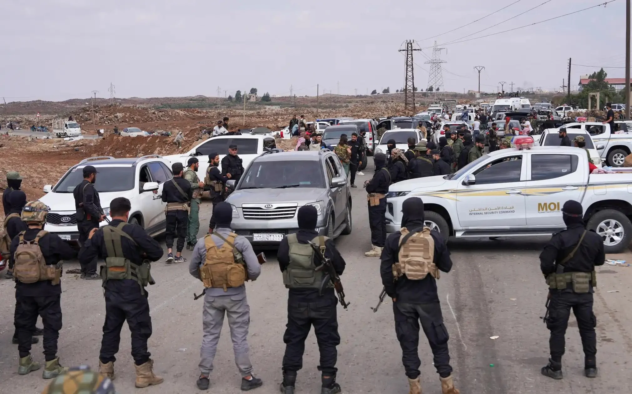 members of The Internal Security Force in Syria stand at a checkpoint to prevent the advance of Bedouin Fighters. July 20, 2025 Photograph: Karam Almasri/Reuters