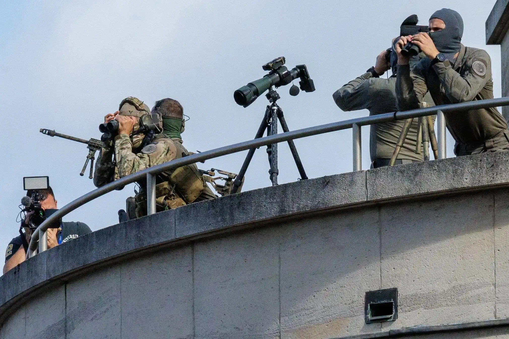 Snipers sit atop a cathedral in Brussels, Belgium. July 21, 2025 Photograph: Oliver Matthys/EPA