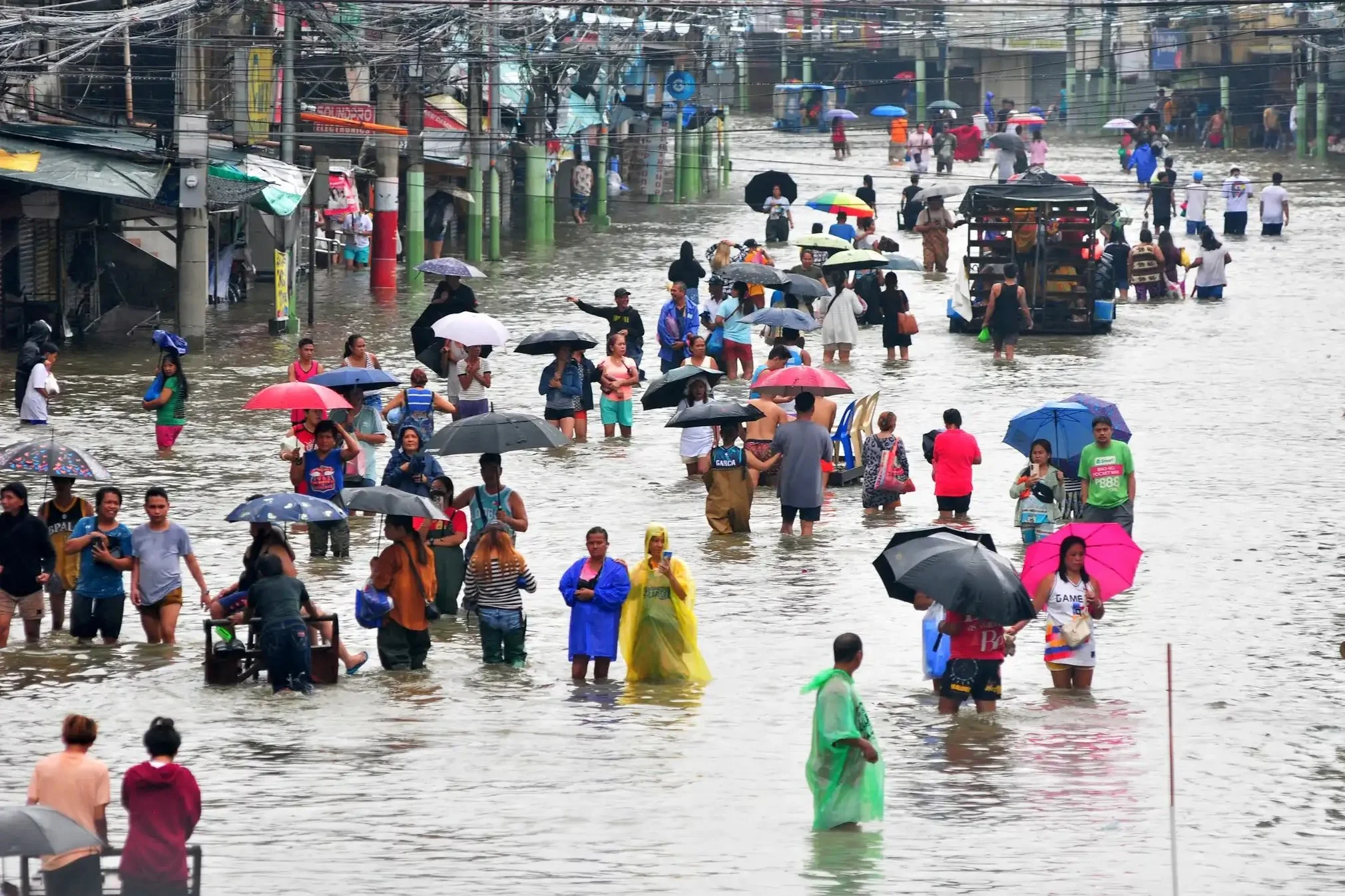 People are seen walking through flooded streets following torrential rain in the Pangasinan region of the Philippines. July 24, 2025 Photograph: AFP/Getty Images