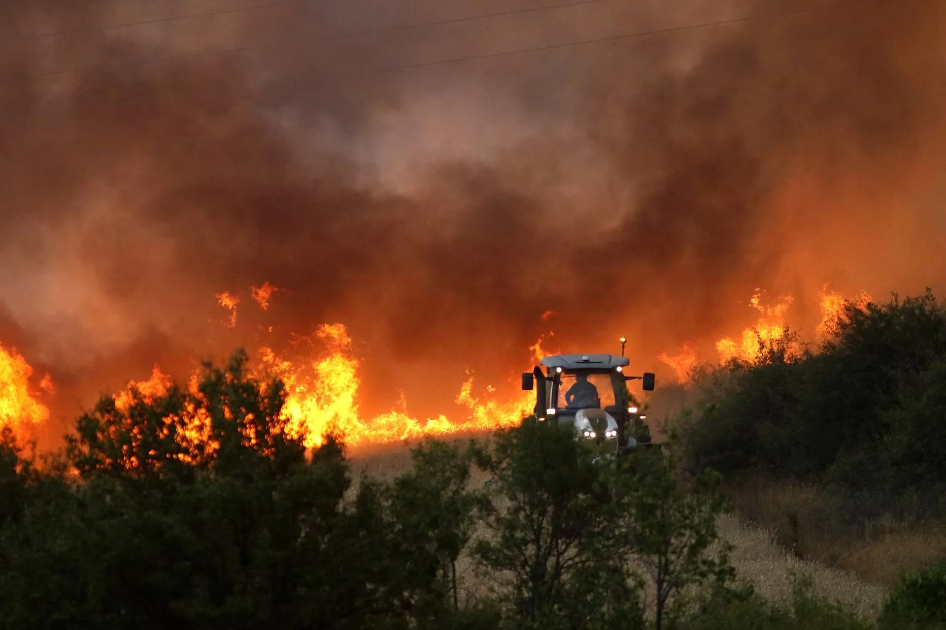 A tractor is seen driving as wildfires burn in Bulgaria. July 23, 2025 Photograph: Stringer/Reuters