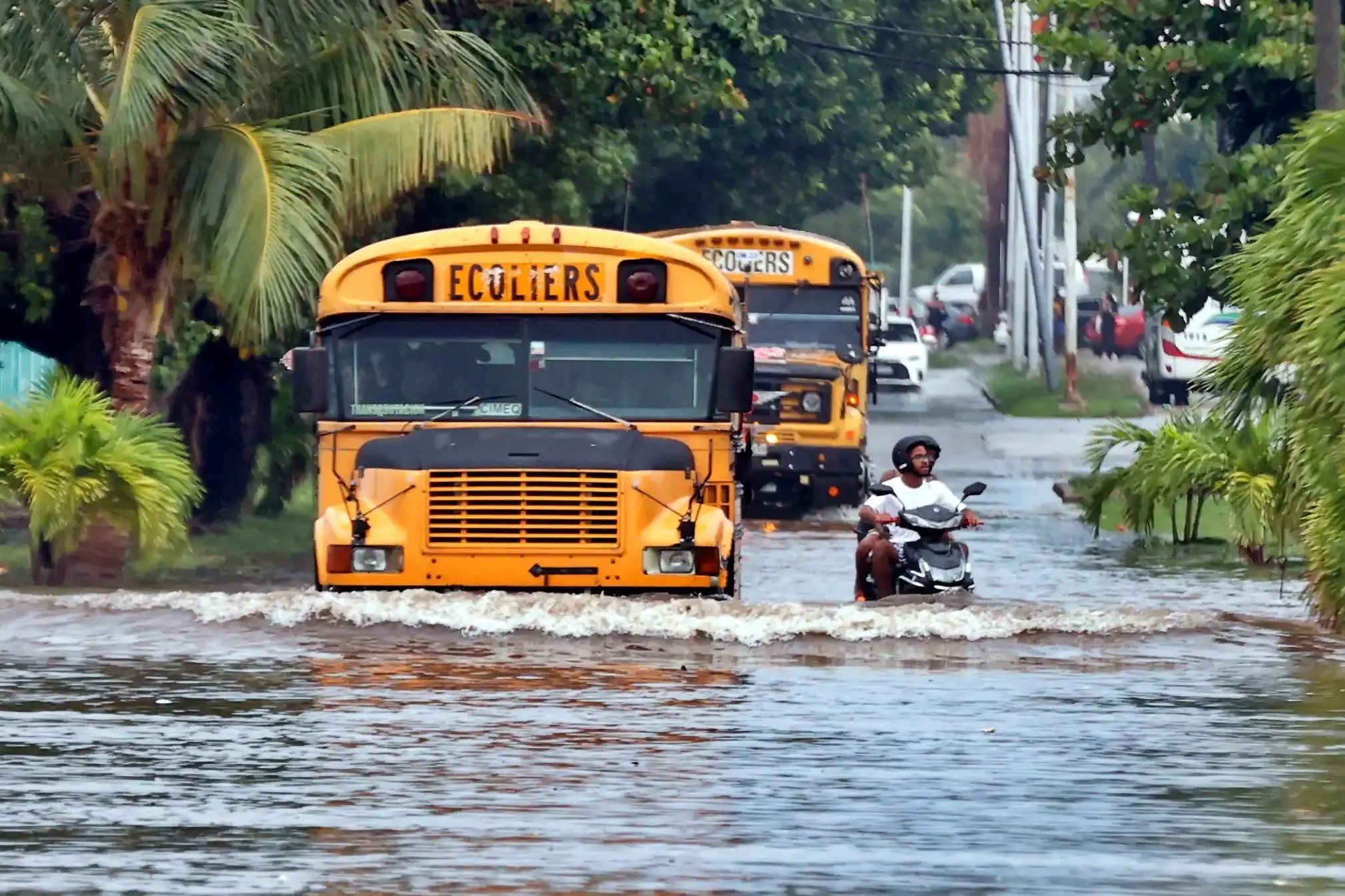 A school bus In Cuba is seen driving through flooded streets. August 13, 2025 Photograph: Ernesto Mastrascusca/EPA.