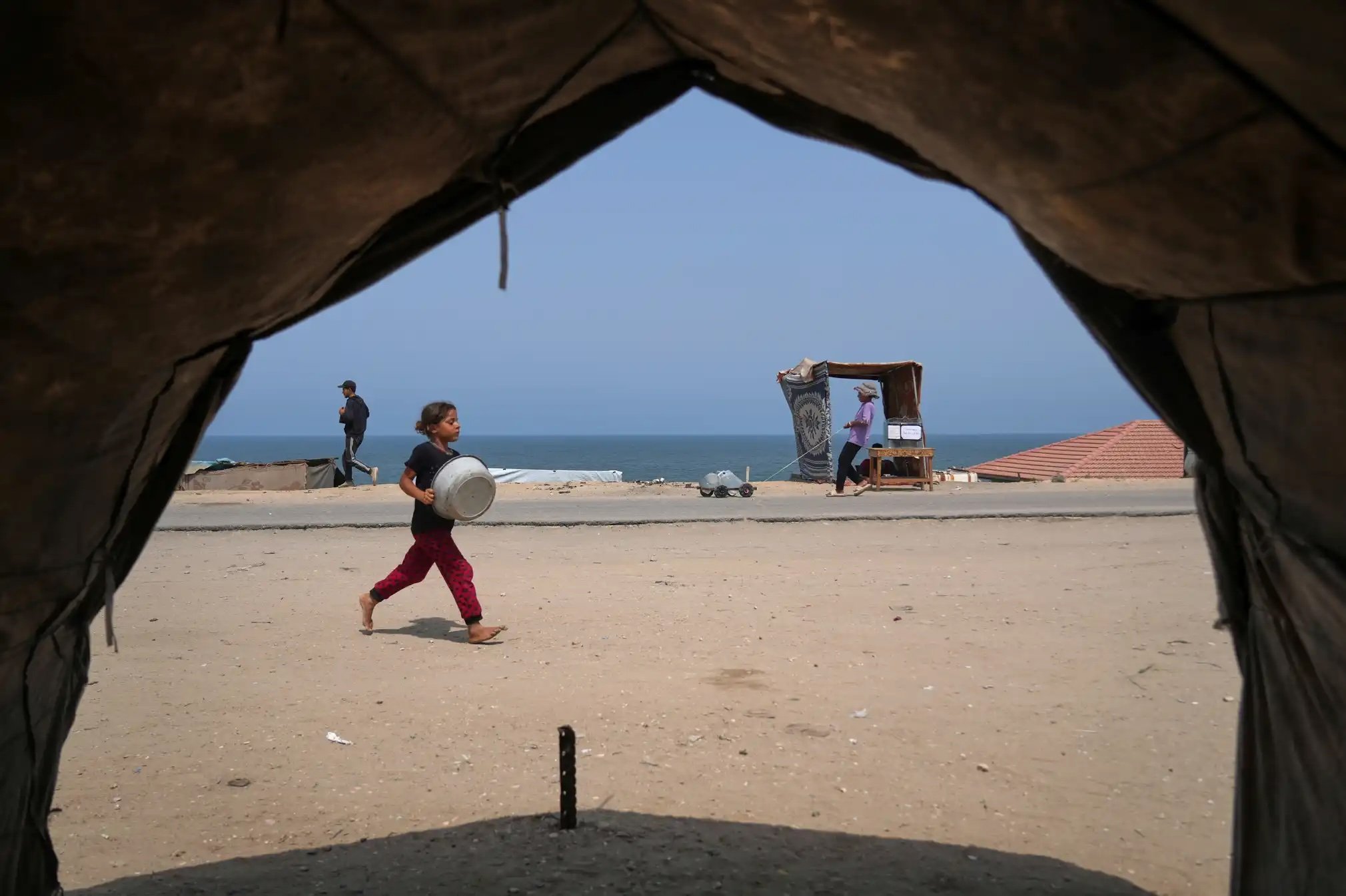 A girl in Gaza runs to get water a a water distribution site. August 14, 2025 Photograph: Abdel Kareem Hana/AP