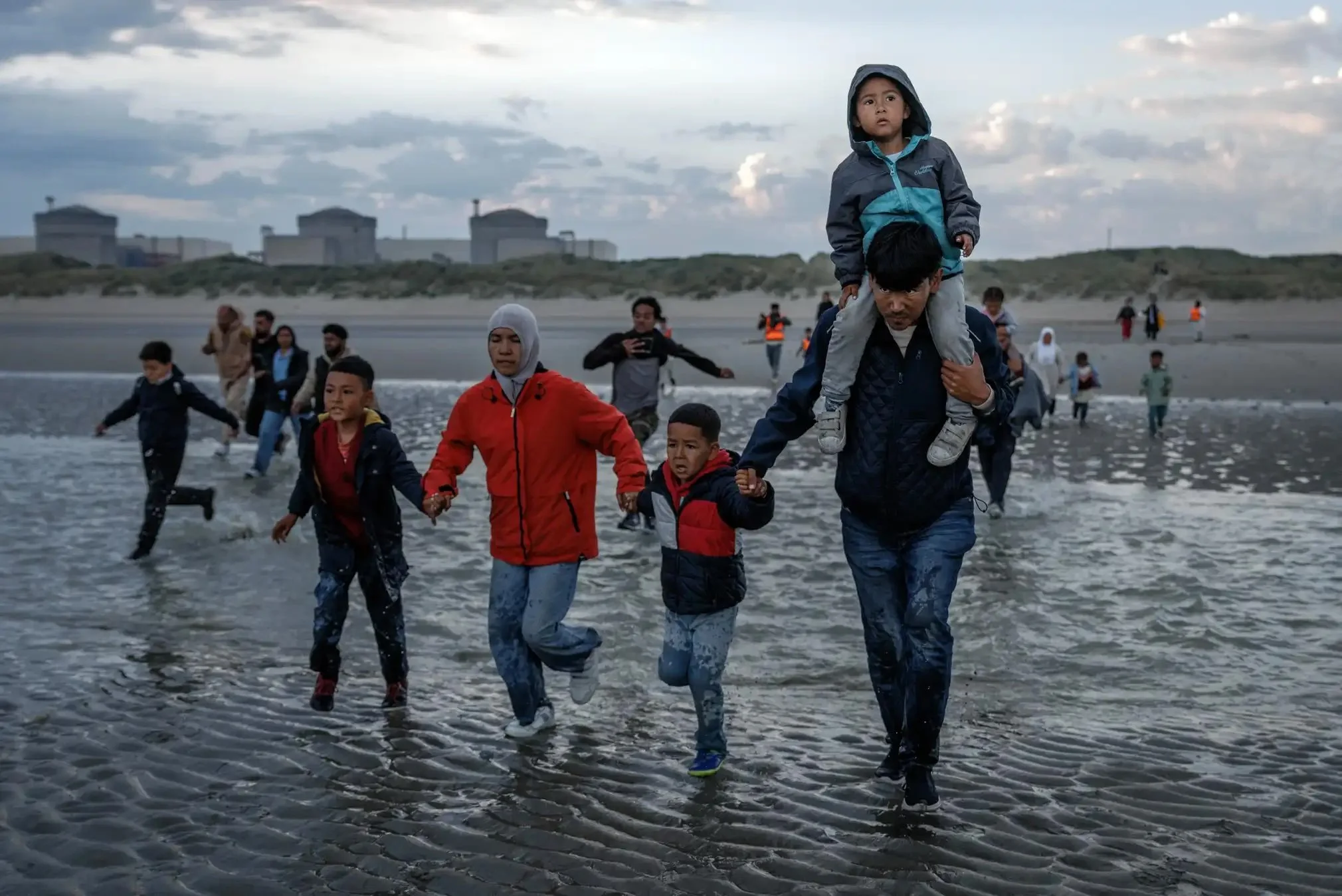People in France are seen running into the water in an attempt to board a boat to cross the English Channel to go to England. August 12, 2025 Photograph: Dan Kitwood/Getty images