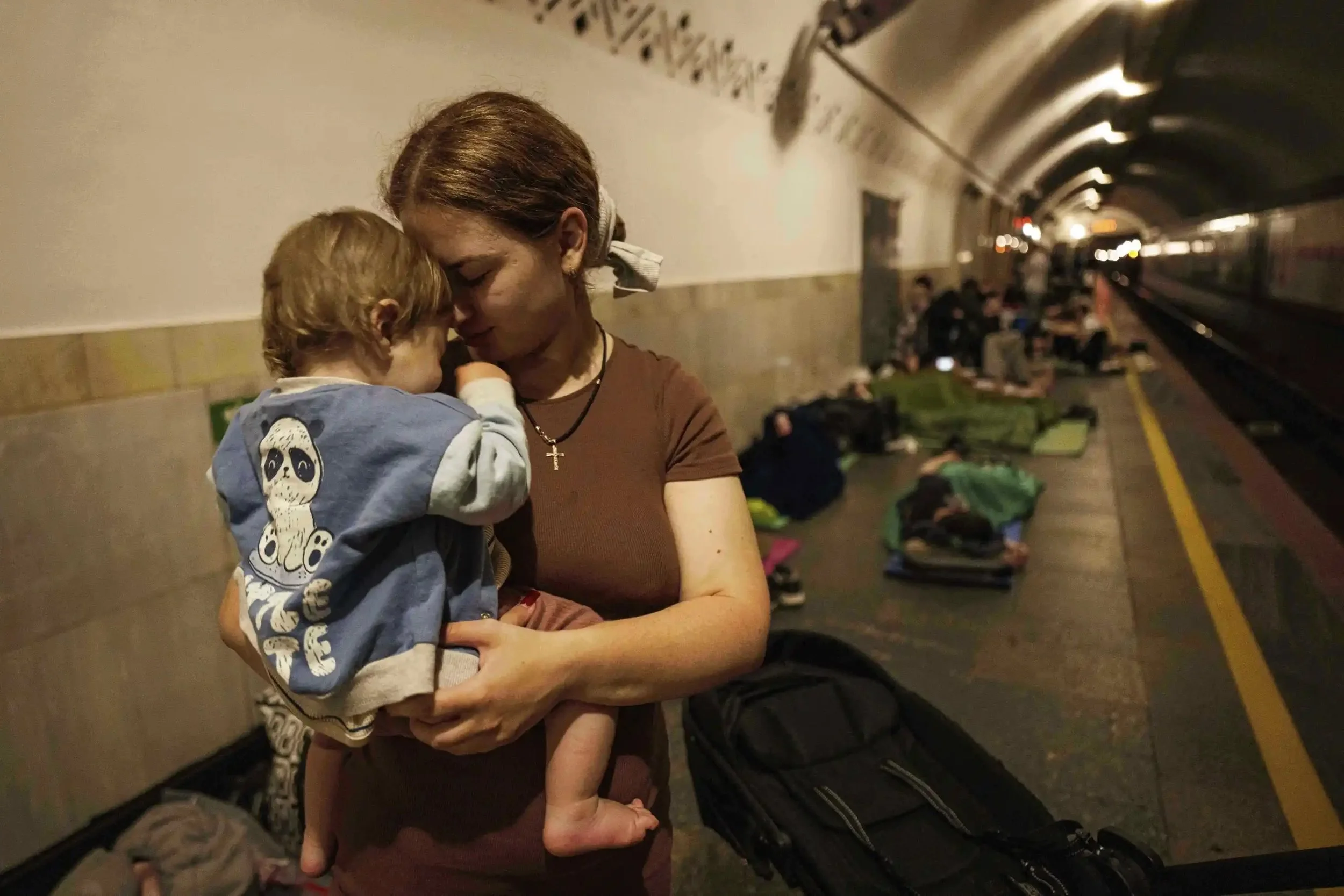A mother is seen consoling her son as they seek shelter in a train station following a Russian missile attack. July 10, 2025 Photograph: AP Photo/ Evgeniy Maloletka