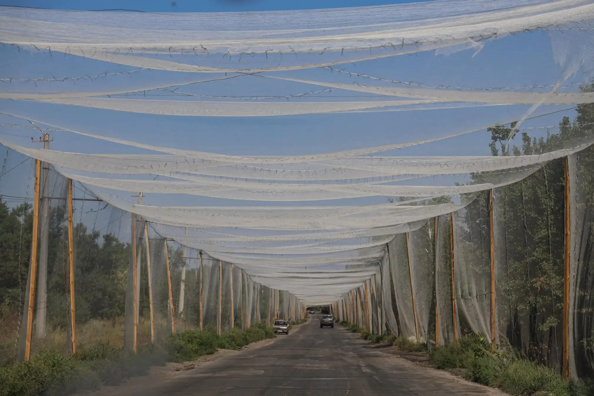 Cars are seen driving on a road that is covered by an anti-drone net. August 6, 2025 Photograph: Oleksandr Ratushniak/Reuters