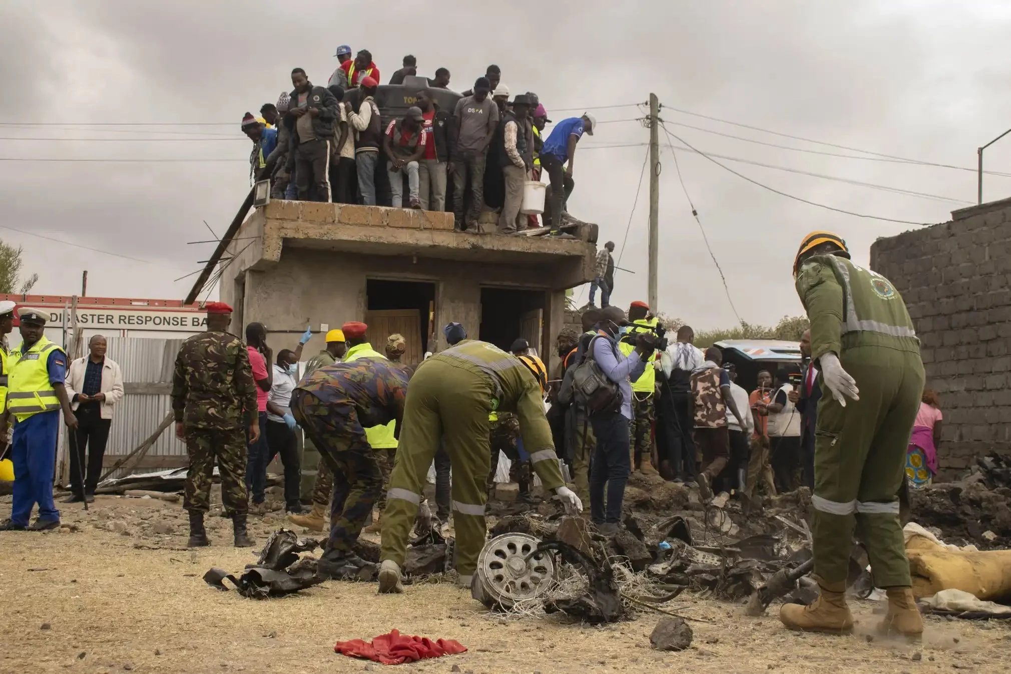 Rescue workers in Nairobi, Kenya are seen looking through the wreckage of an air ambulance that crashed into a small village. August 8, 2025 Photograph: Kevin Midigo/Zuma Press Wire/Shutterstock