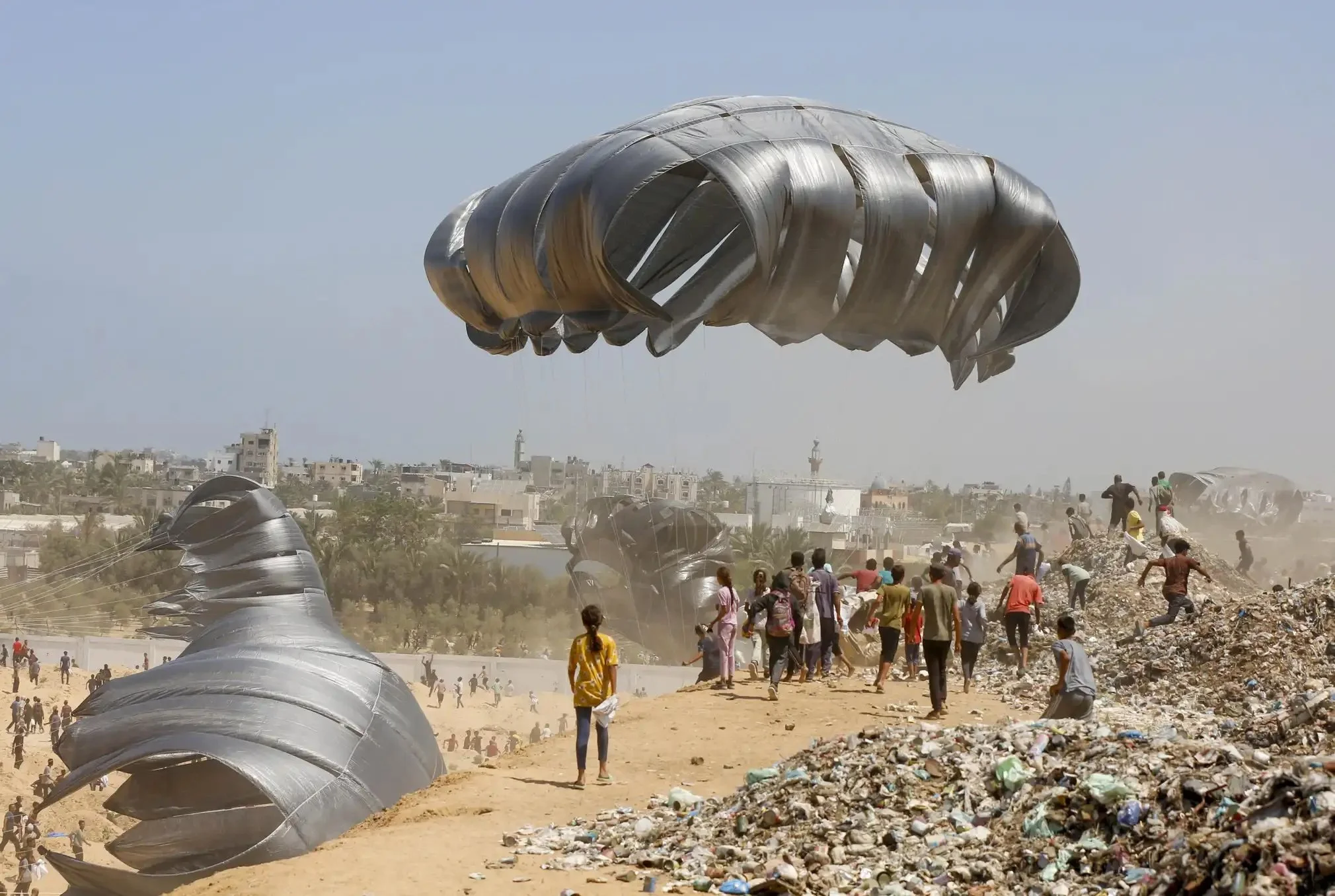 Aid arrives from above in Gaza. August 22, 2025 Photograph: Anadolu/Getty images