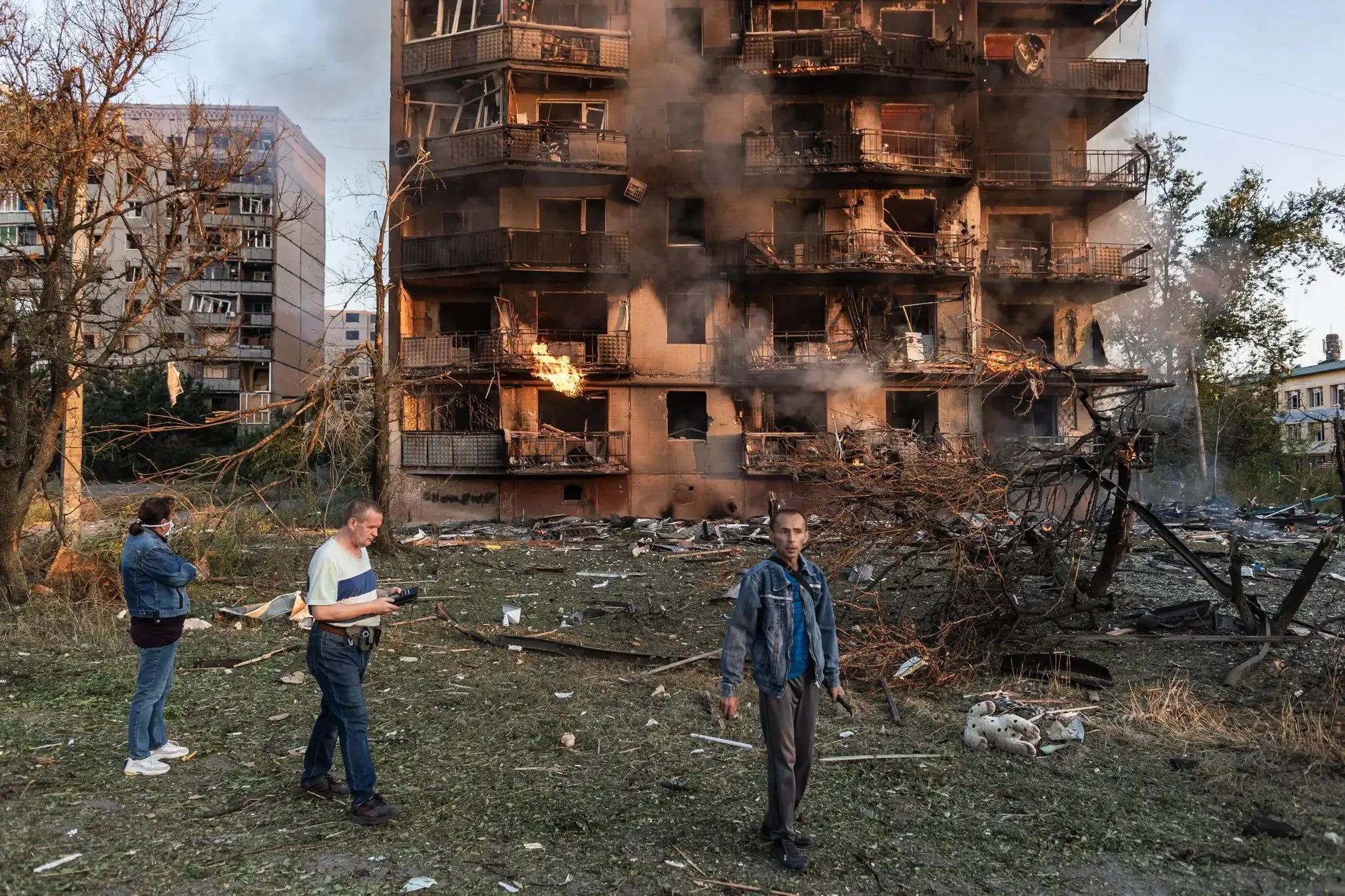 People are seen observing damage done to a building in Ukraine after a Russian strike. August 22, 2025 Photograph: Diego Herrera Carcedo/Anadolu /Getty Images