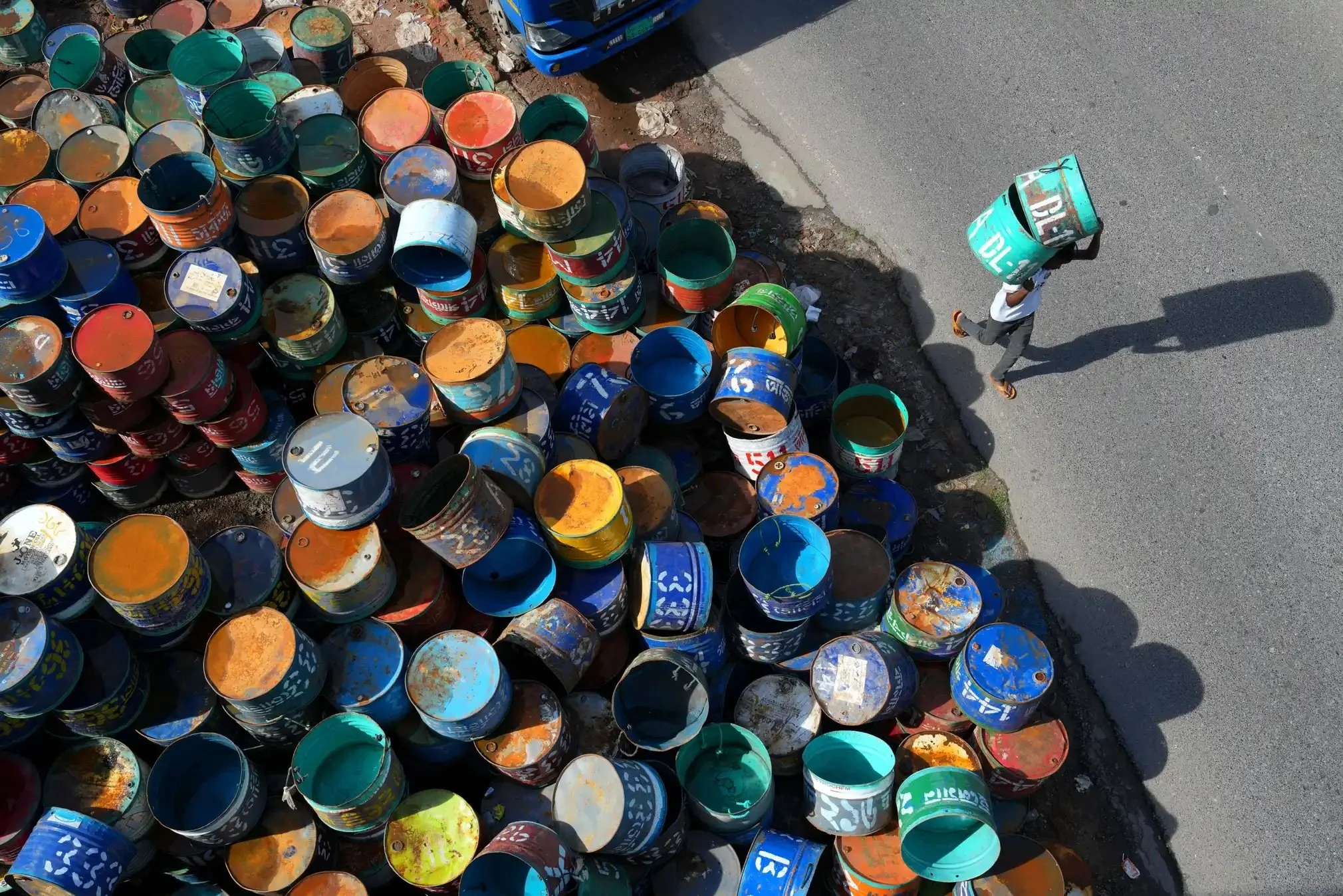 A man in Bangladesh is seen carrying a metal can. August 20, 2025 Photograph: Syed Mahabubul Kader/Zuma Press Wire/Shutterstock .