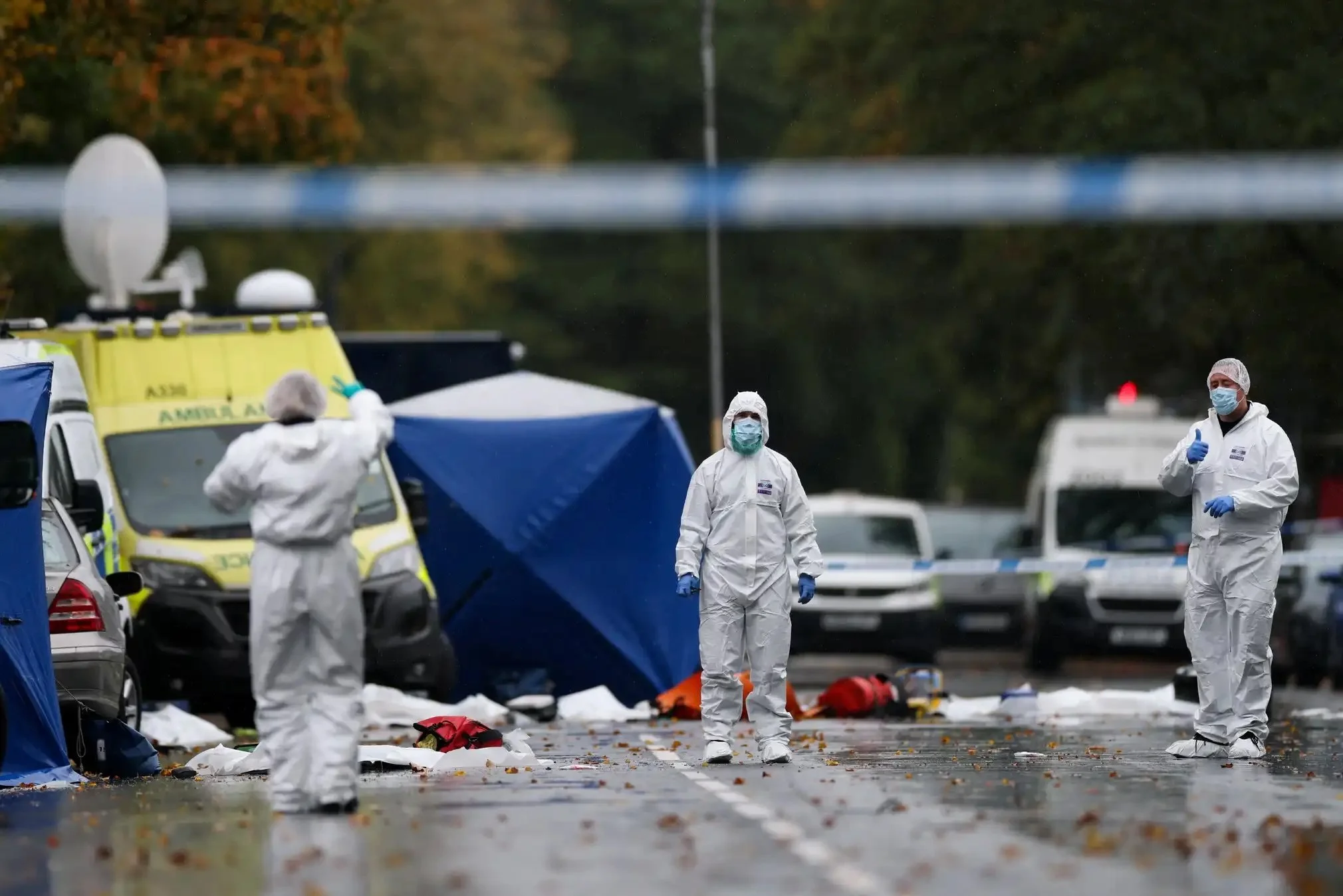 A forensics team is seen working outside of the synagogue that was targeted in a terrorist attack in Manchester, UK. October 3, 2025 Photograph: Hannah McKay/Reuters