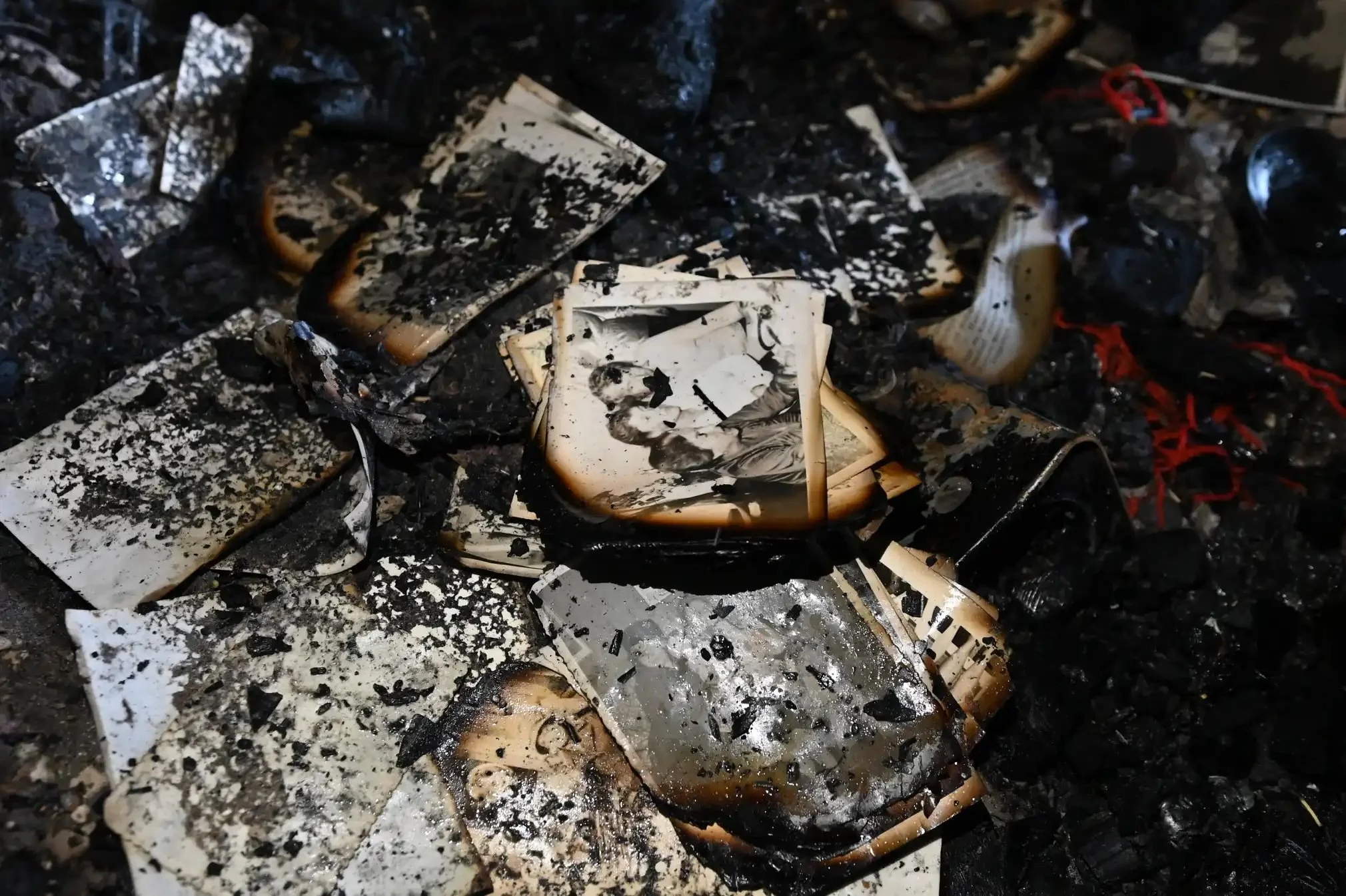Burnt books and photos are picture following Russian airstrikes in Kyiv Ukraine. October 10, 2025 Photograph: Oleksandr Gusev /Global Images Ukraine/Getty Images