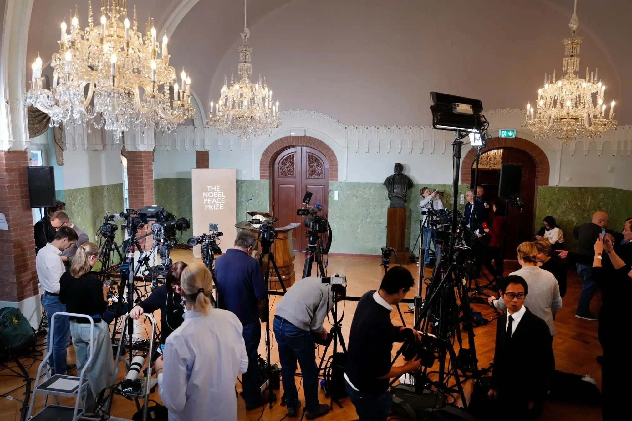 Journalist are seen preparing for the announcement of the winner of the Nobel Peace Prize . October 10, 2025 Photograph: Rodrigo Freitas/EPA