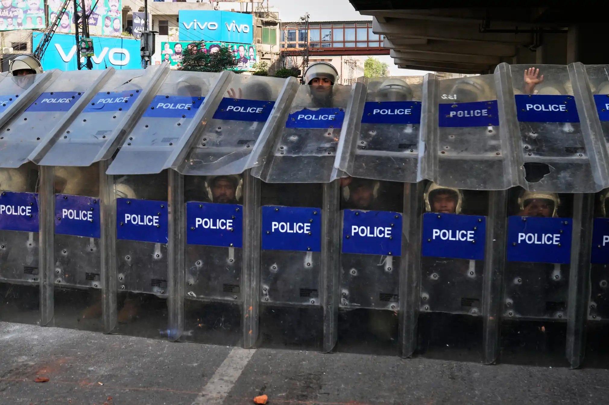 Police in Pakistan are seen preparing for a protest. October 9, 2025 Photograph: KM Chaudary/AP