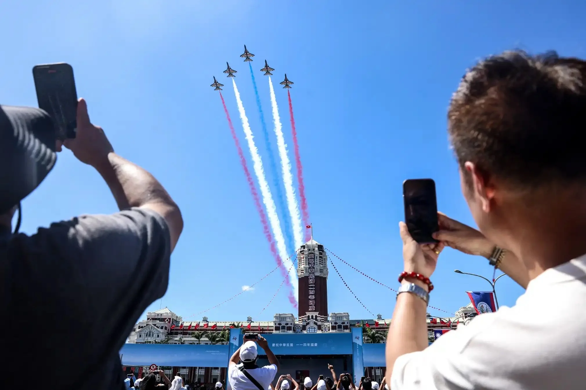 Fighter jets are seen passing over the presidential palace; ace on Taiwan. October 10, 2025 Photograph: I-Hwa Cheng/AFP/Getty Images