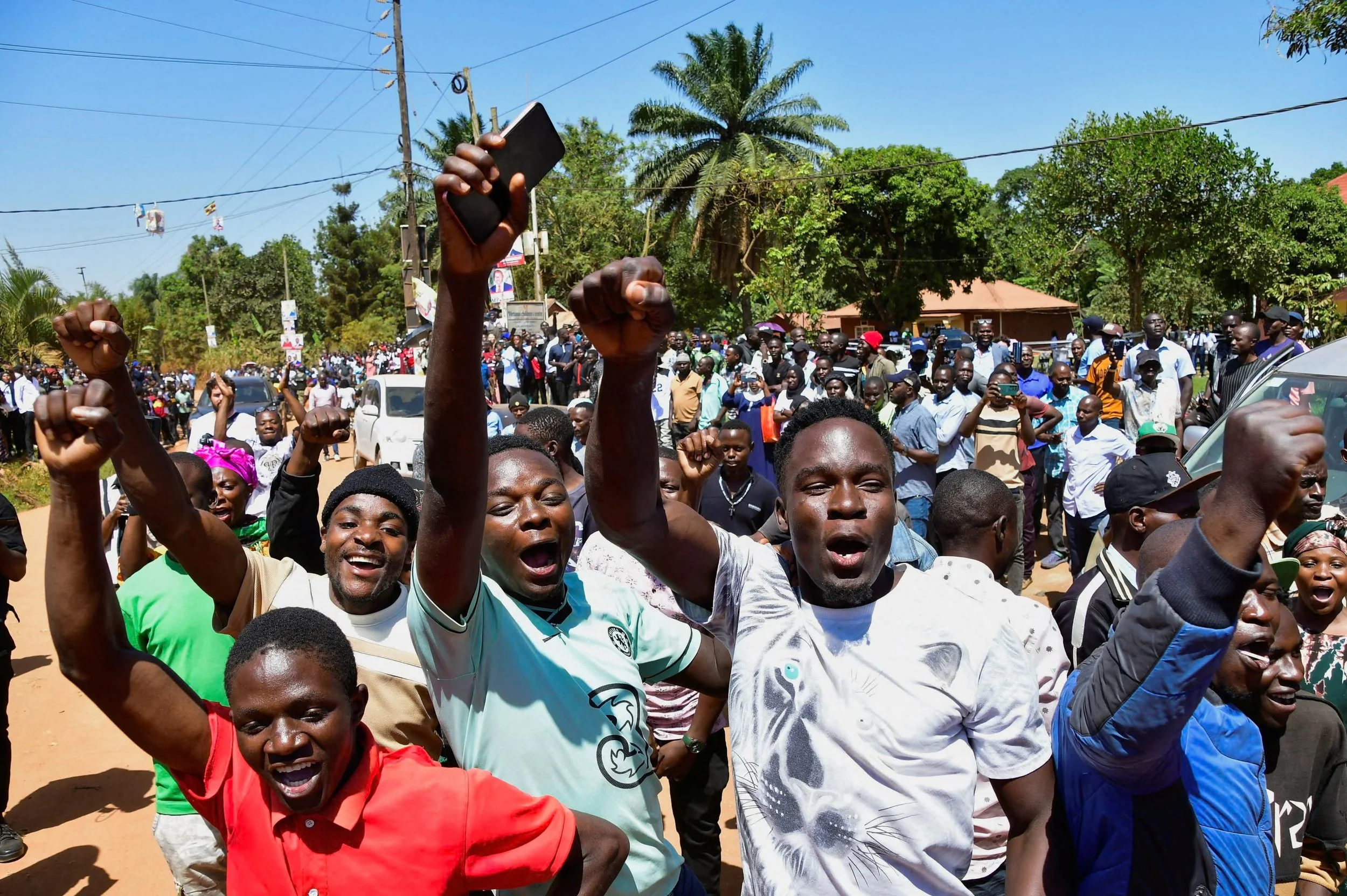 People celebrate following the results of the Ugandan Presidential election. January 15, 2026 Photograph: Abubaker Lubowa/Reuters