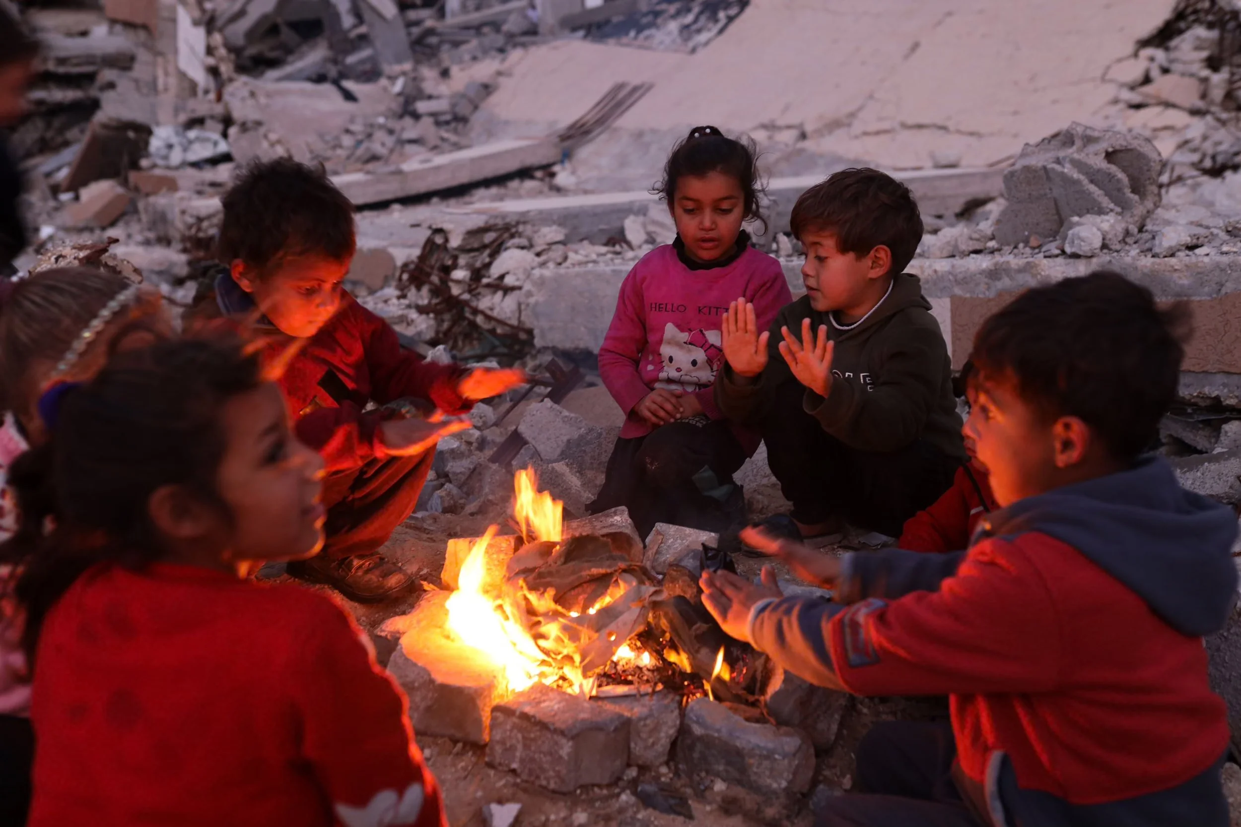 Kids in Gaza sit around a fire. January 15, 2026 Photograph: Majdi Fathi/NurPhoto/Shutterstock