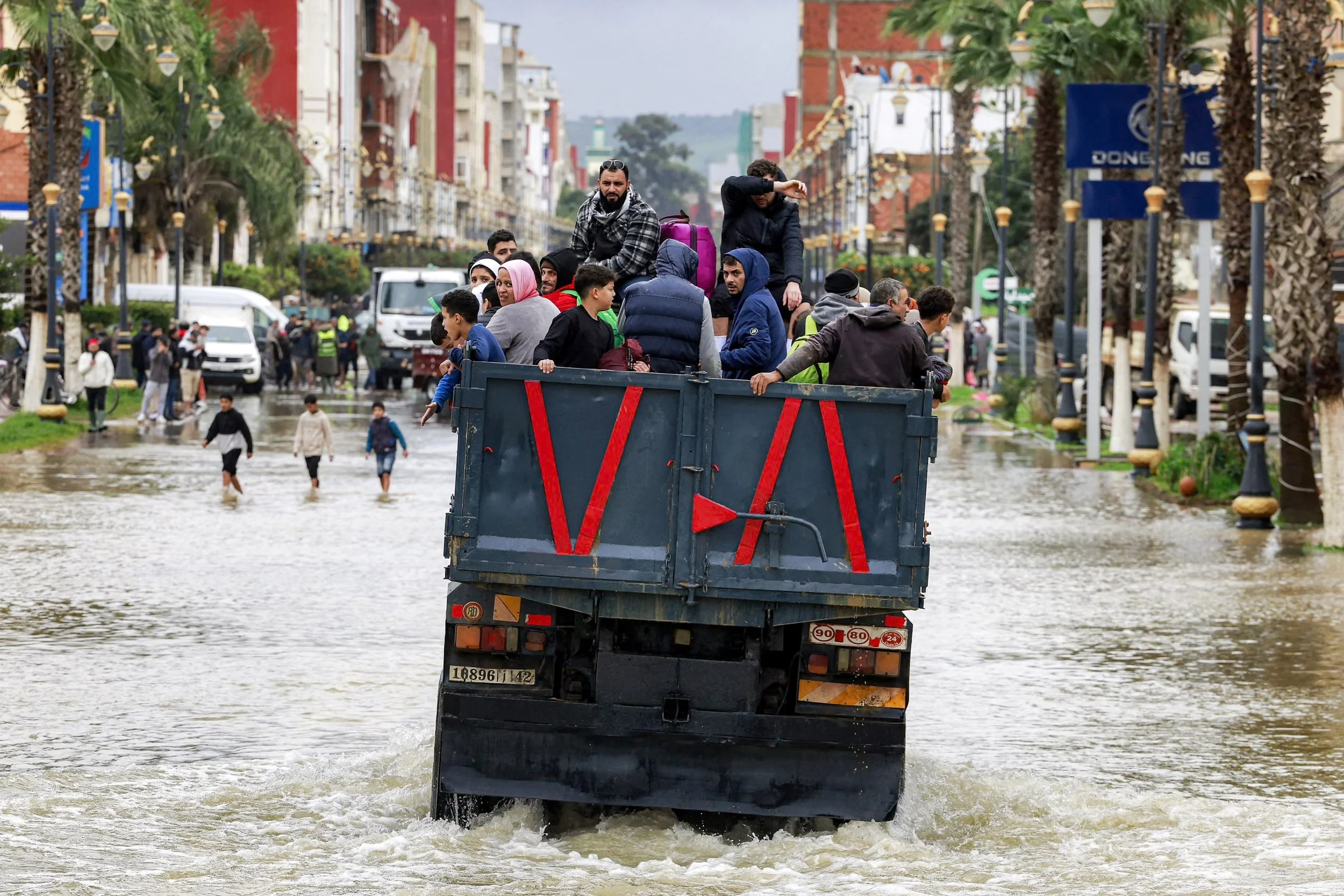 People are seen riding in the back of a truck in Morocco. January 30, 2026 Photograph: Abdel Majid Bziouat/AFP/Getty Images