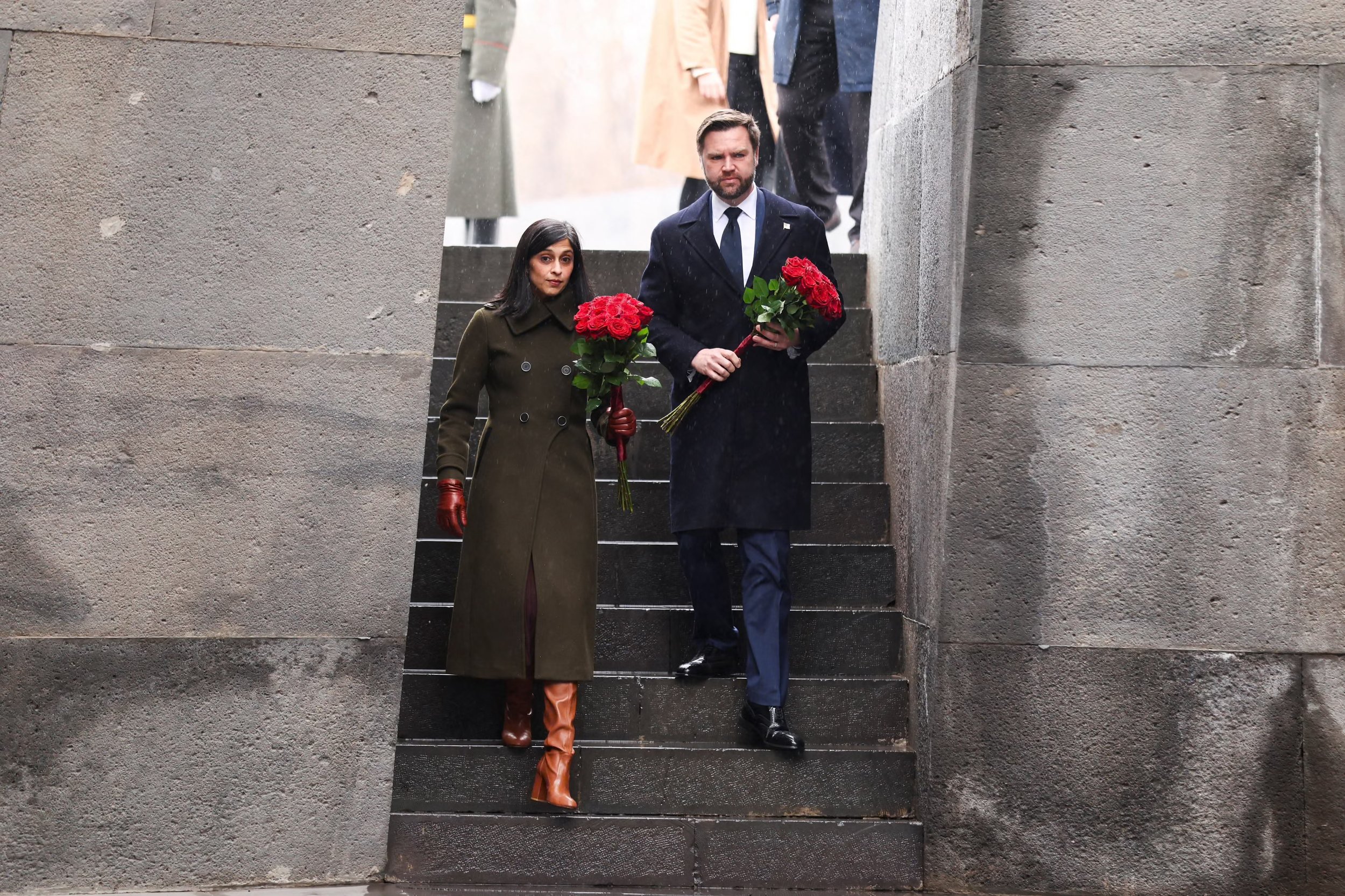 Vice President JD Vance and his wife lay flowers at the Armenian genocide memorial in Armenia. February 10, 2026 Photograph: Kevin Lamarque/Reuters