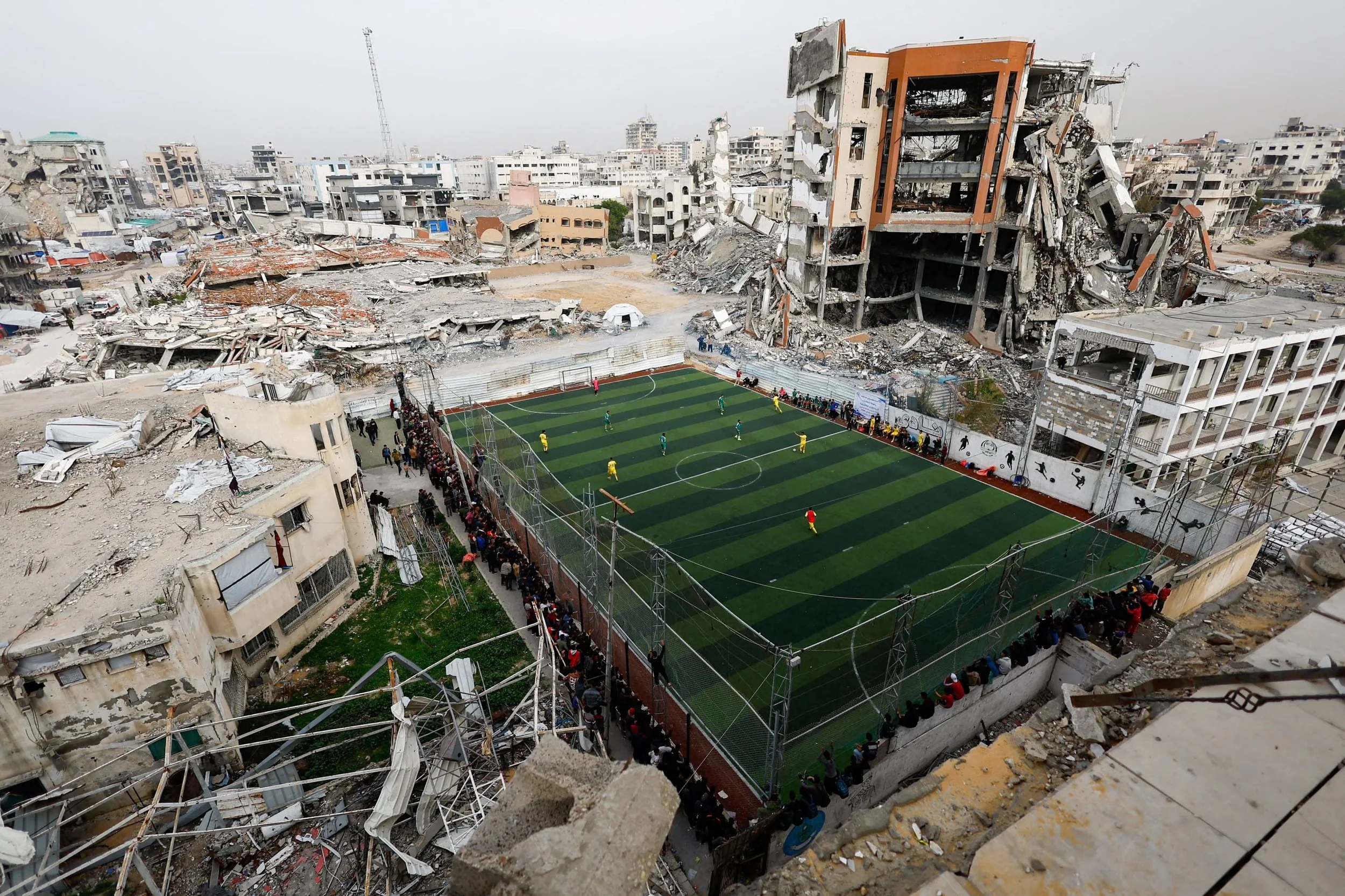 Palestinians play soccer in Gaza. February 9, 2025 Photograph: Mahmoud Issa/Reuters