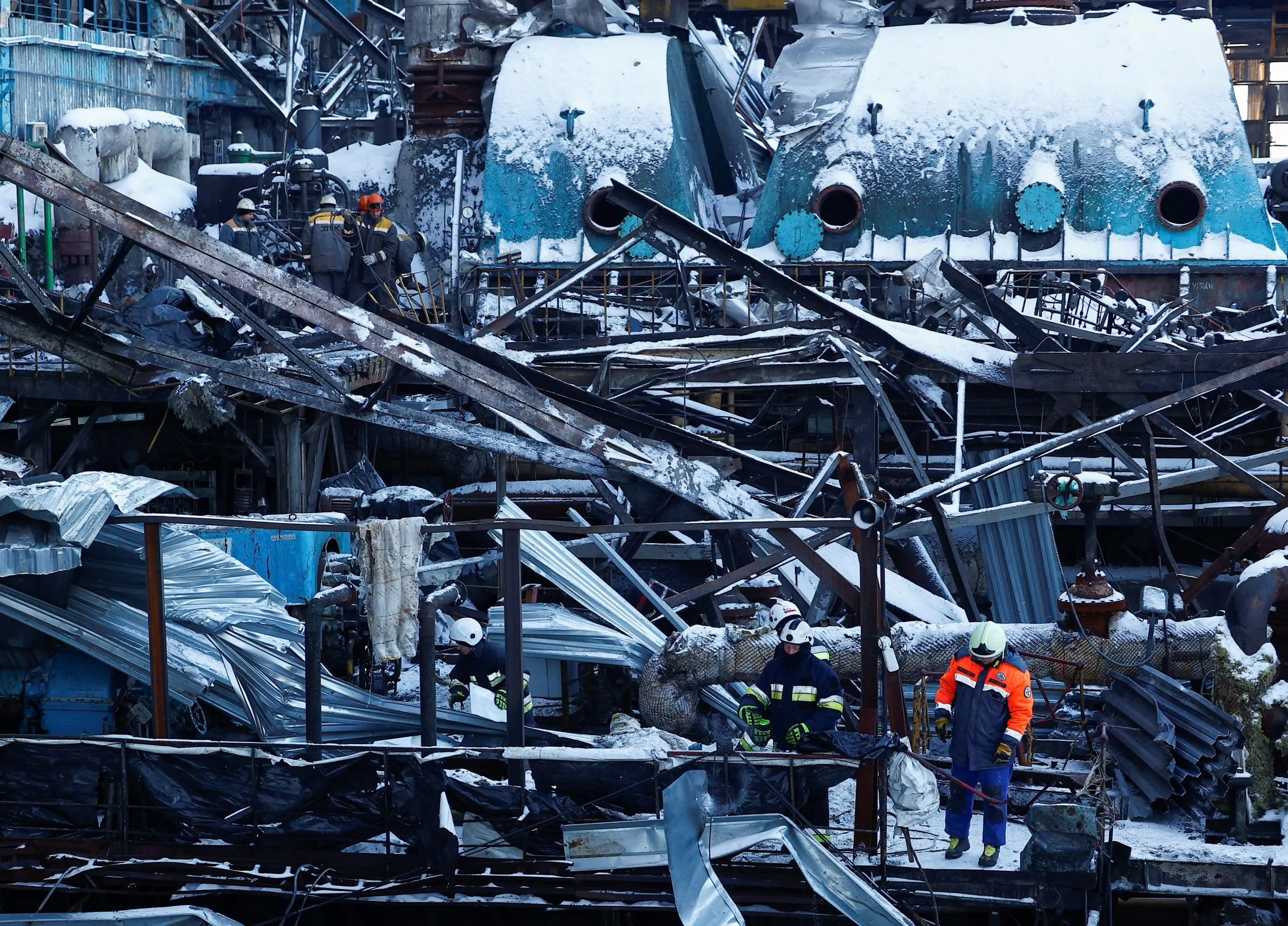 Rescue workers inspect a destroyed building. February 10, 2026 Photograph: Valentyn Ogirenko/Reuters