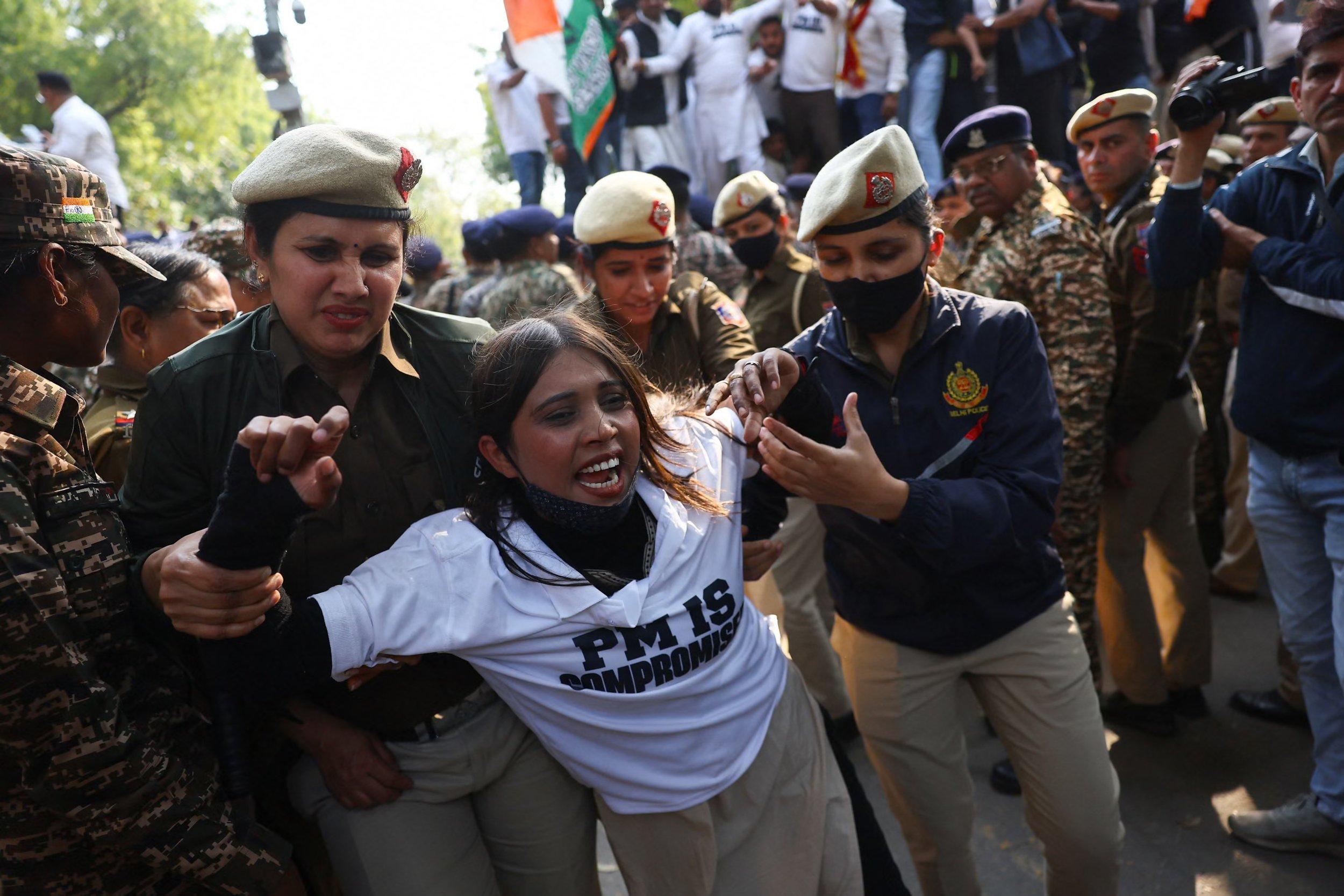 A women is seen being led away by police in India. February 10, 2026 Photograph: Anushree Fadnavis/Reuters