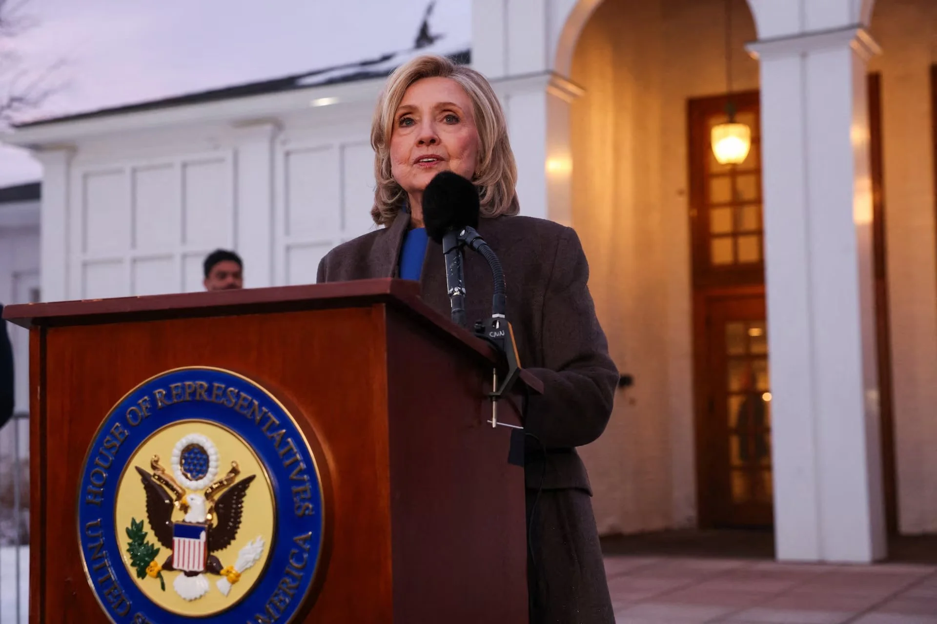 Hillary Clinton is seen answering questions from the press. February 27, 2026 Photograph: REUTERS/Shannon Stapleton